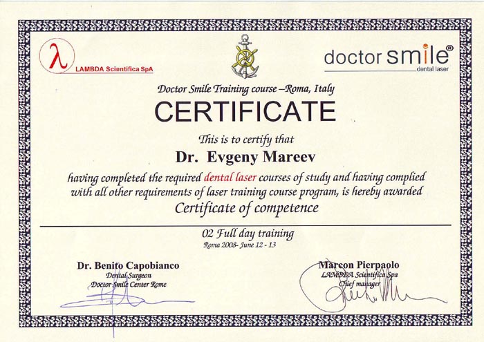 Сертификат подтверждает, что Мареев Евгений, врач-стоматолог, консультант по стоматологическим лазерам компании GREEN DENT, успешно прошел обучающий курс по применению лазеров Dr. Smile от компании Lambda S.p.A. в стоматологии.