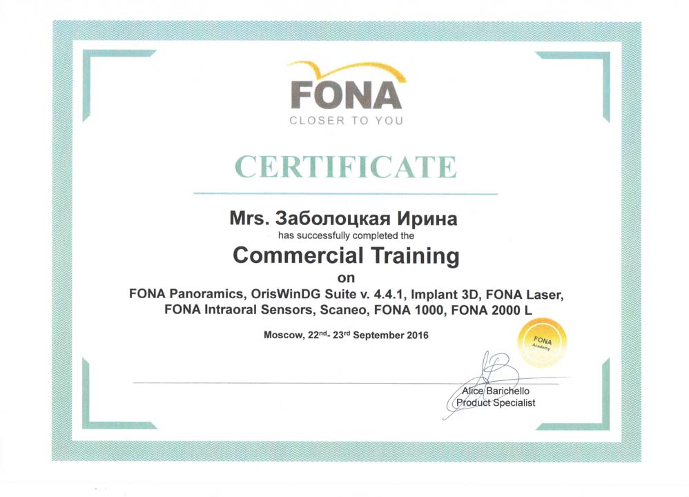 Руководитель сервисного отдела компании «ГРИН ДЕНТ», Заболоцкая Ирина, успешно прошла тренинг по оборудованию FONA.